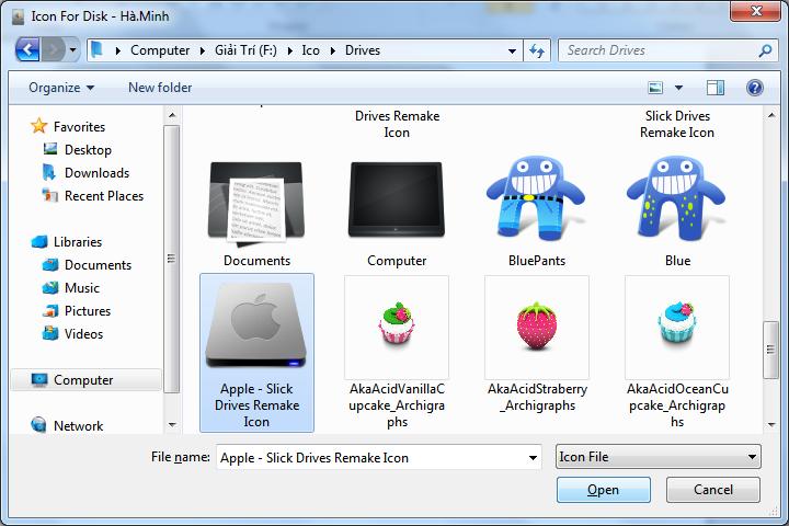 - Sau khi chọn được file.ico các bạn nhấn "Open" hoặc click 2 lần vào file đó để cài Icon đã chọn cho ổ đĩa: